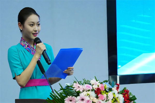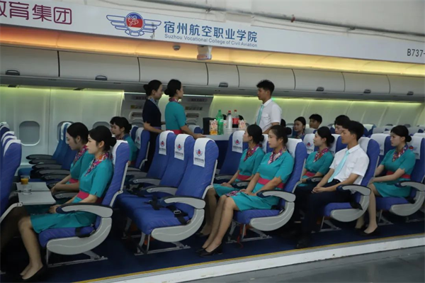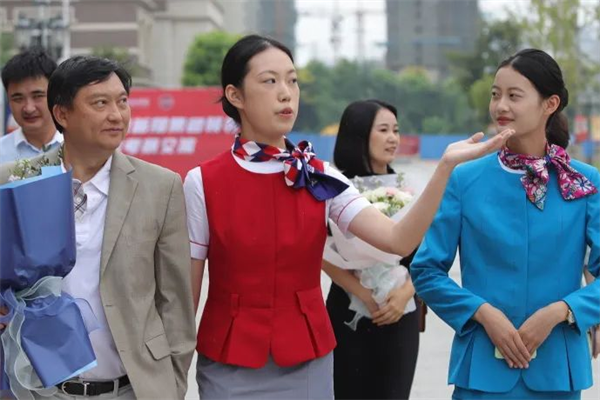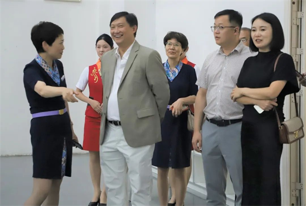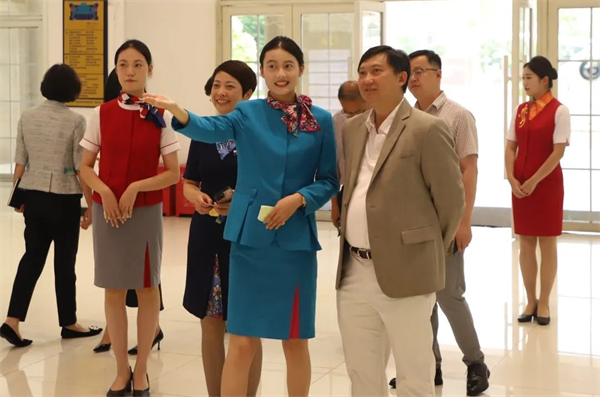 在实训中心,宿航学子们向新翔集团领导们展示了空中乘务服务技能,将平日所学化为所用,尽显宿航学子“高度职业化的民航员工”风采。