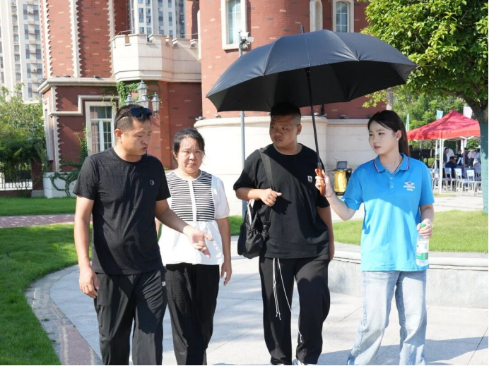 无人机编队在人群上空巡航,喷洒细腻水雾,为现场的新生及家长带来阵阵清凉👨‍🦰,让炎炎烈日下的报到流程变得清爽舒适。身着统一服装的志愿者们,主动为新生和家长撑伞遮阳并提供引导服务,这些无微不至的关怀🧸,展现了学院以人为本的温情关怀。