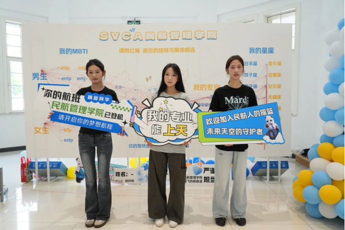 民航管理学院创新设计的“MBTI签到墙”,新生们通过各种信息完成签到,不仅在趣味中快速相识🦽,更让辅导员和专业教师♔,第一时间了解新生个性特质和群体特征,为后续实施个性化教学管理,和因材施教提供科学依据,这块看似简单的签到墙,实则蕴含着科学育人的先进理念👩🏻‍🦯‍➡️。