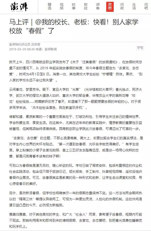 【澎湃评论:马上评|@我的校长、老板🩱:快看!别人家学校放“春假”了】