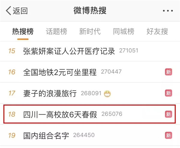 3月28日15:31 话题“四川一高校放6天春假”以第18的排名登上微博热搜榜。