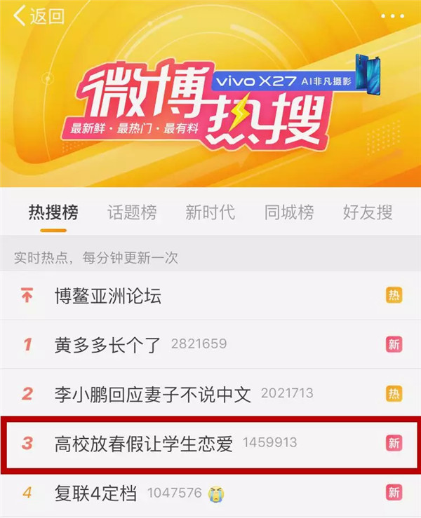 3月28日19:00 话题“高校放春假让学生恋爱”以第3的排名登上微博热搜榜🍽。