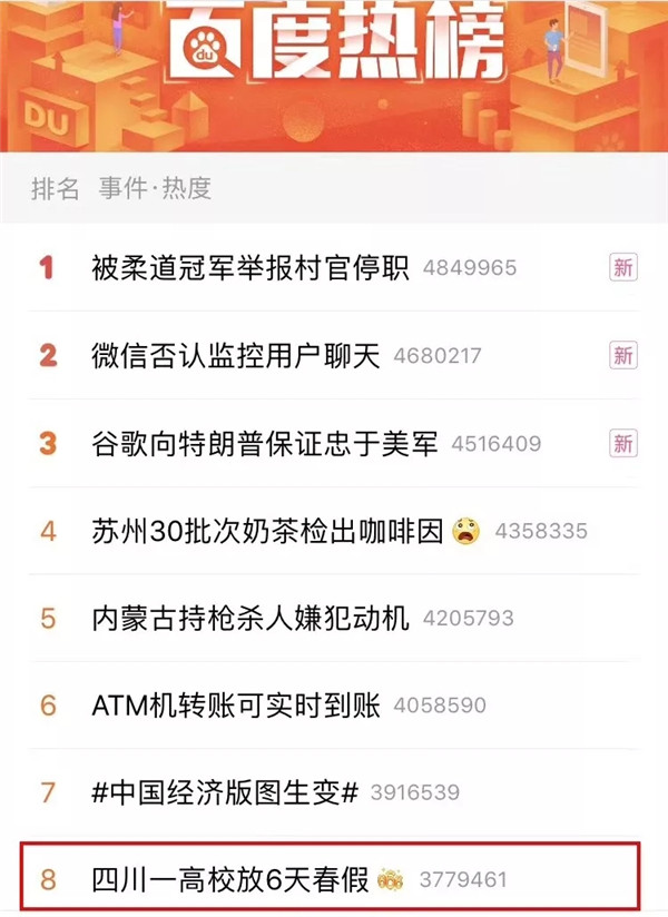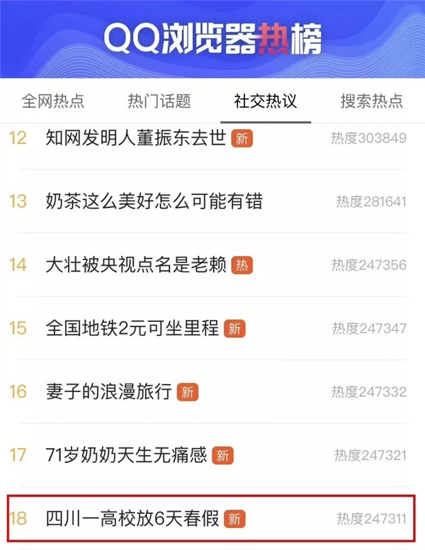 除了微博热搜榜🤾🏼♀️,“四川一高校放6天春假”的话题还登上了其他多个新闻客户端的头条推送、热搜版……