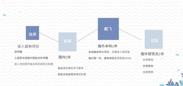 第三年📎:海外”2+2“本硕直通车进入韩国高校开始本科大三阶段学习,发放海外名校”研究生预录取通知书“完成本科学分课程毕业后,直接进入韩国名校大学院(研究生院)学习🔱。