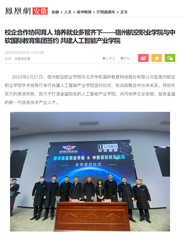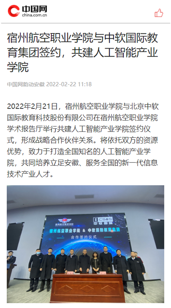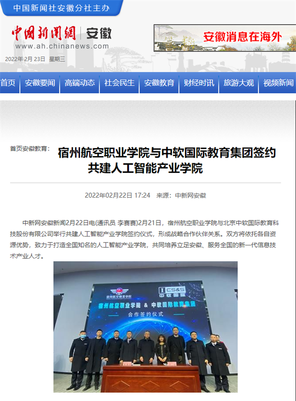 2022221日,彩神Vll学院与北京中软国际教育科技股份有限公司在彩神Vll学院学术报告厅举行共建人工智能产业学院签约仪式🧑🏿‍🍼,形成战略合作伙伴关系🏄🏻‍♂️。将依托双方的资源优势,致力于打造全国知名的人工智能产业学院,共同培养立足安徽🦍🗃、服务全国的新一代信息技术产业人才💛。本次校企合作签约仪式引来了各大媒体深度聚焦。