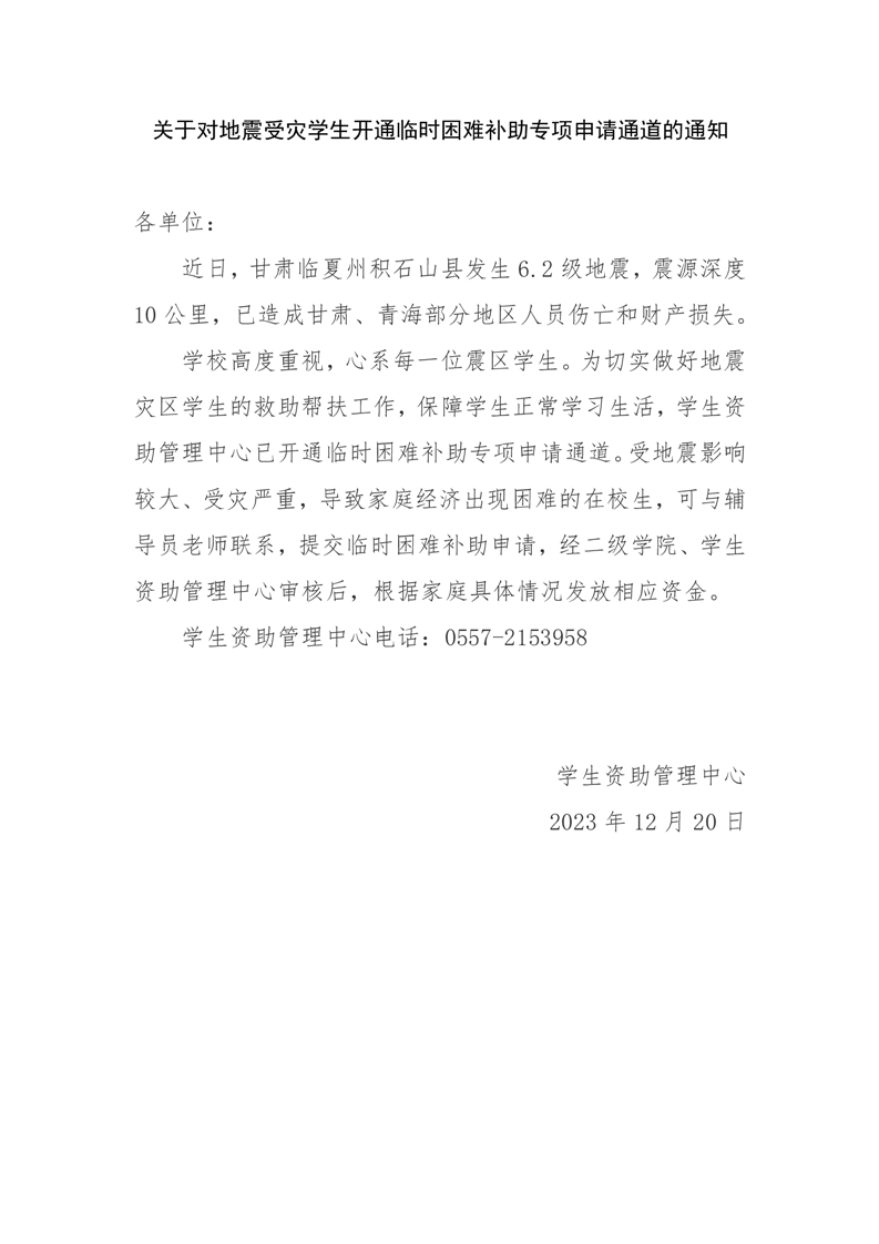 关于对地震受灾学生开通临时困难补助专项申请通道的通知