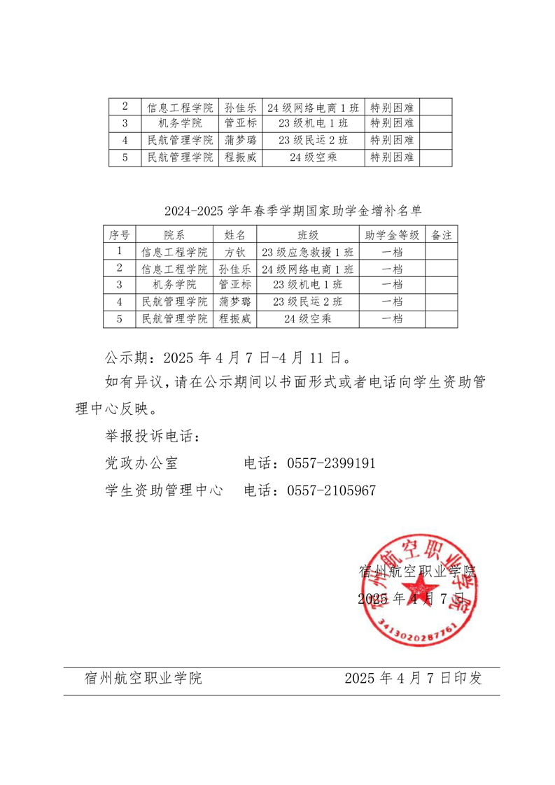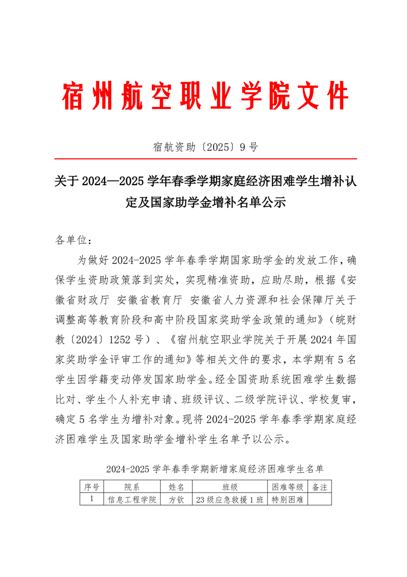 2024—2025学年春季学期家庭经济困难学生增补认定及国家助学金增补名单公示