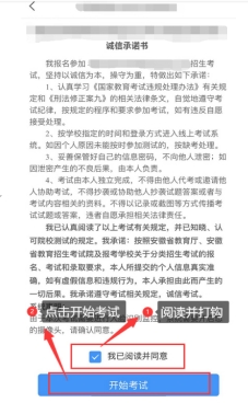 2.点击考试按钮,阅读并同意考生承诺后进行打钩🤰,点击“开始考试”;