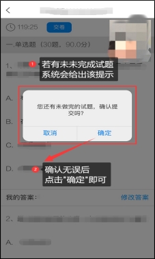 5.核查作答情况时,可修改选择答案🪲;确认无误后,点击最上方的“交卷”按钮,并确认提交🛌🏻。(若存在未作答题目,系统会提示,请注意核查!)