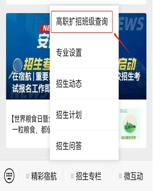 2.进入公众号后,点击“招生专栏”👇,点击上方“高职扩招班级查询”;