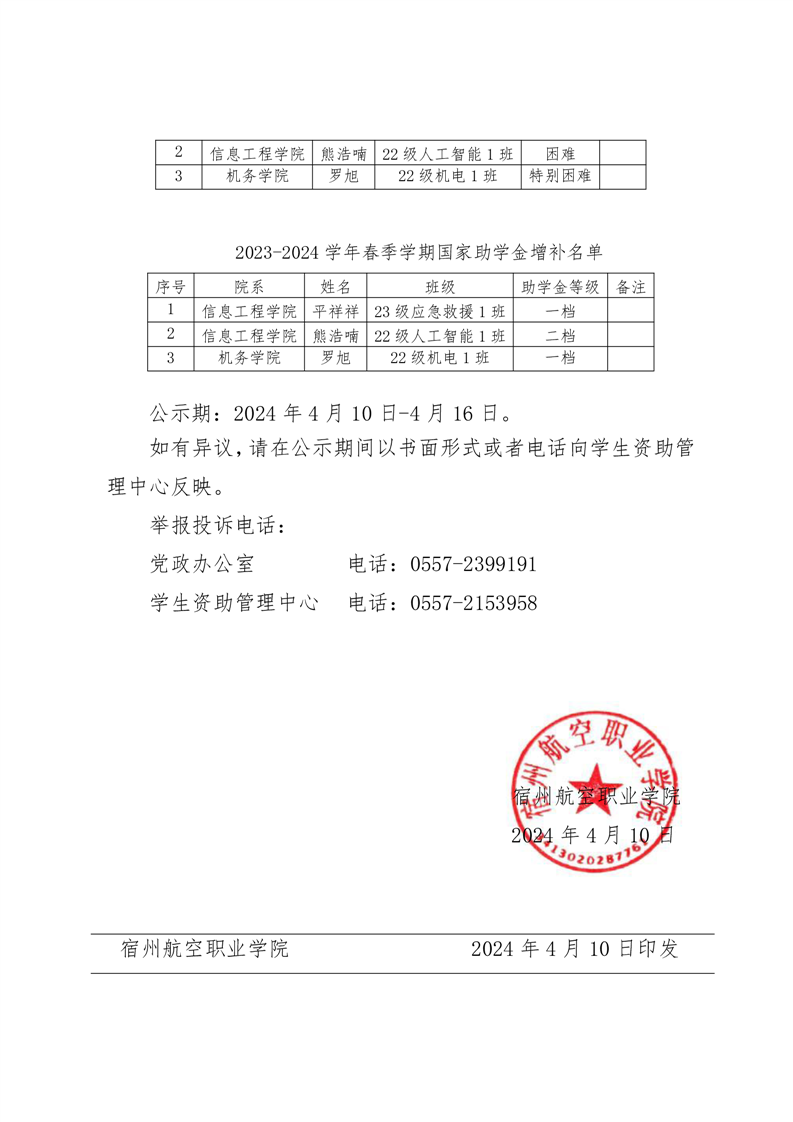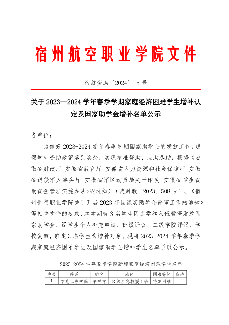 2023—2024学年春季学期家庭经济困难学生增补认定及国家助学金增补名单公示