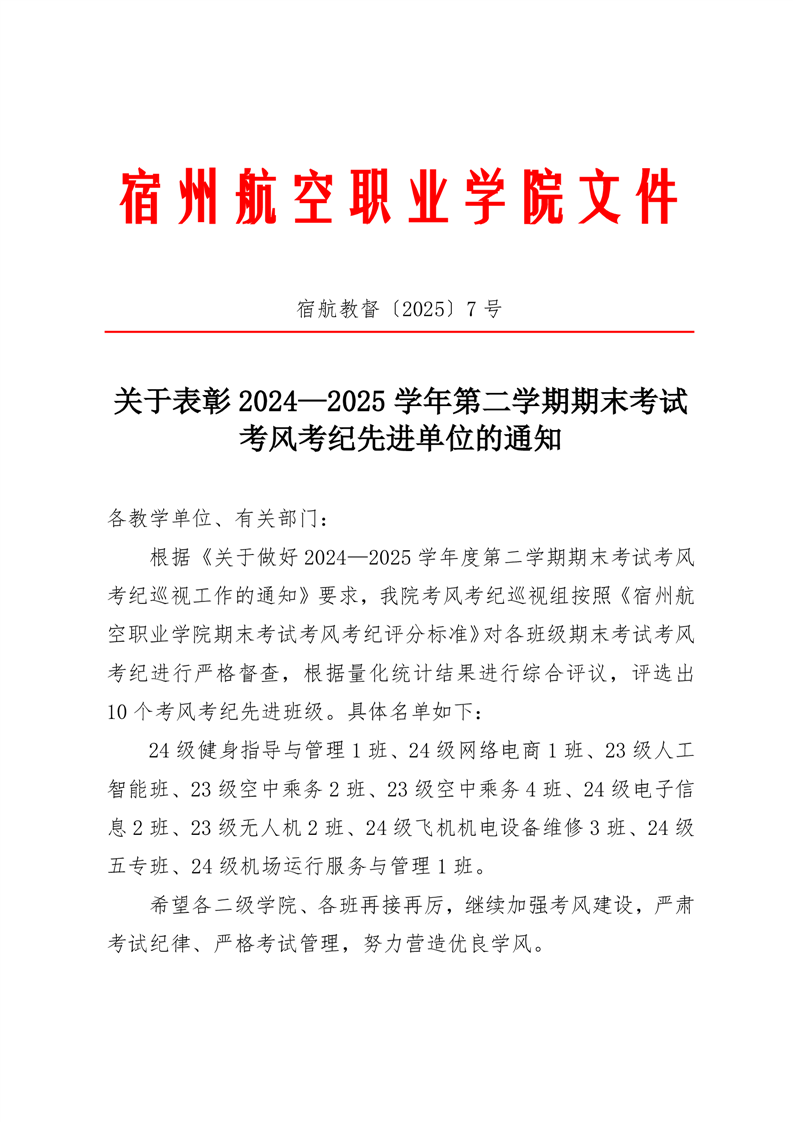 关于表彰2024—2025学年第二学期期末考试考风考纪先进单位的通知