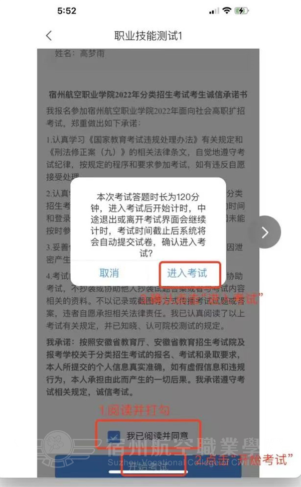 2.点击考试按钮,阅读并同意考生承诺后进行打钩🧑🏻‍🦼,点击“开始考试”📟;
