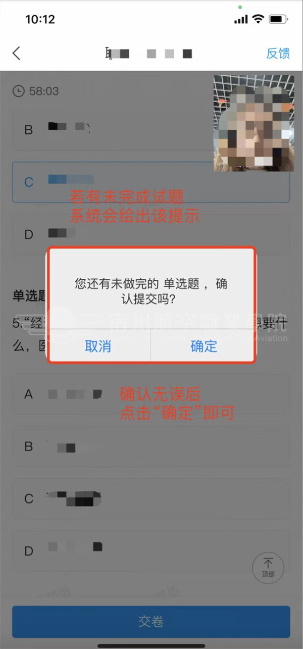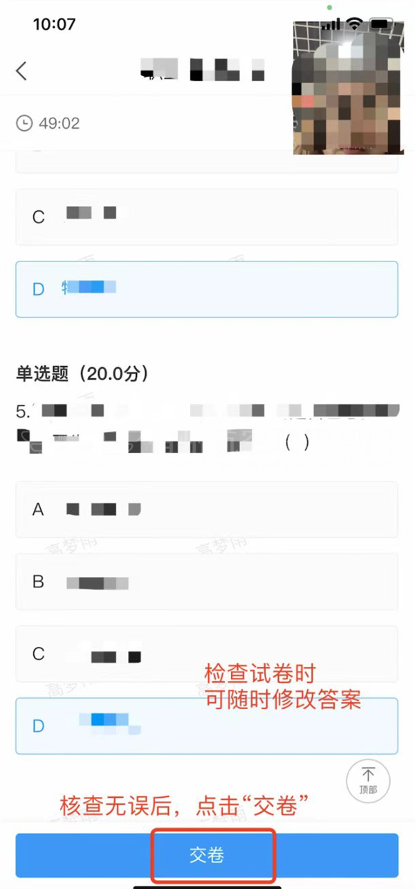 5.核查作答情况时,可修改选择答案;确认无误后🙅🏽,点击最上方的“交卷”按钮,并确认提交。(若存在未作答题目,系统会提示,请注意核查🛵!)