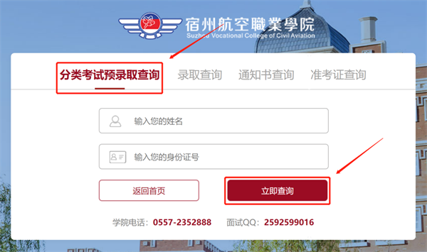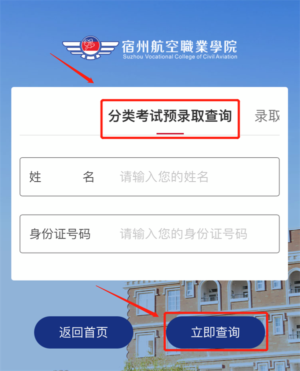 2.进入后点击“分类考试预录取查询”,根据提示填写学生“姓名”及“身份证号码”,填写正确后🤼,点击下方“立即查询”;