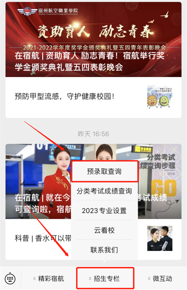 2.进入公众号后点击下方“招生专栏”,之后点击上方“预录取查询”👨🏽‍🍼🧑‍🦱,进入查询页面;
