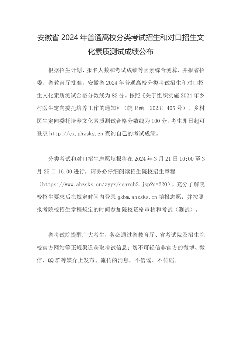 安徽省2024年普通高校分类考试招生和对口招生文化素质测试成绩公布