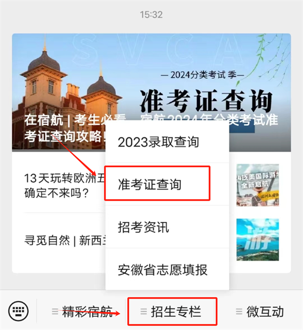 2.进入公众号后点击下方“招生专栏”,之后点击上方“准考证查询”,进入查询页面;