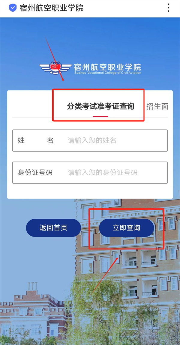 2.进入后点击“分类考试准考证查询”,根据提示填写学生姓名及身份证号码,填写正确后🍖,点击下方“立即查询”;