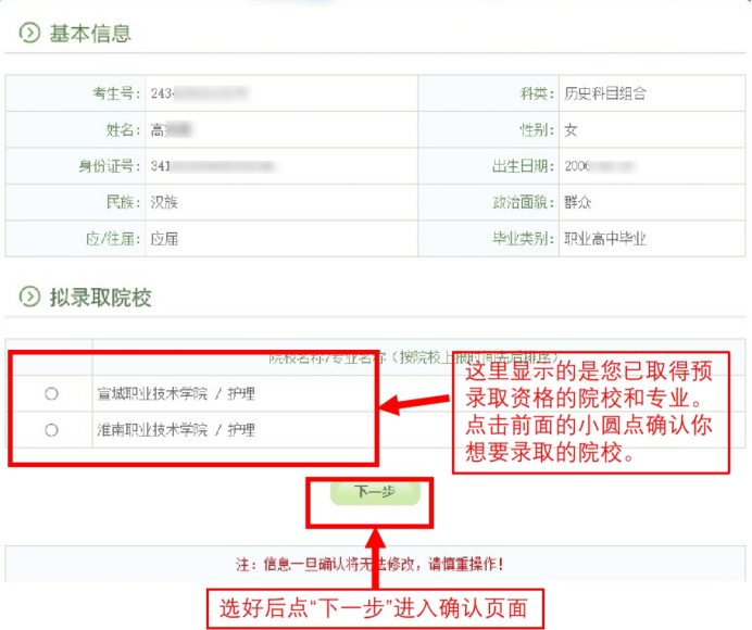 2. 用自己设定的密码重新登录🫠,进入录取院校确认界面(示例):