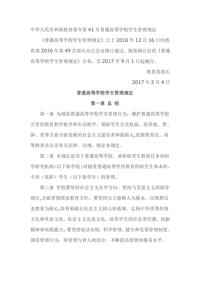 中华人民共和国教育部令第41号普通高等学校学生管理规定