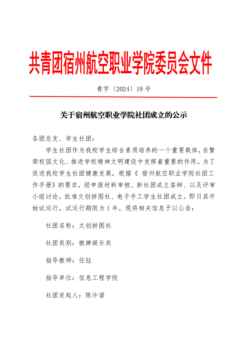 青字〔2024〕19号关于彩神Vll学院社团成立的公示