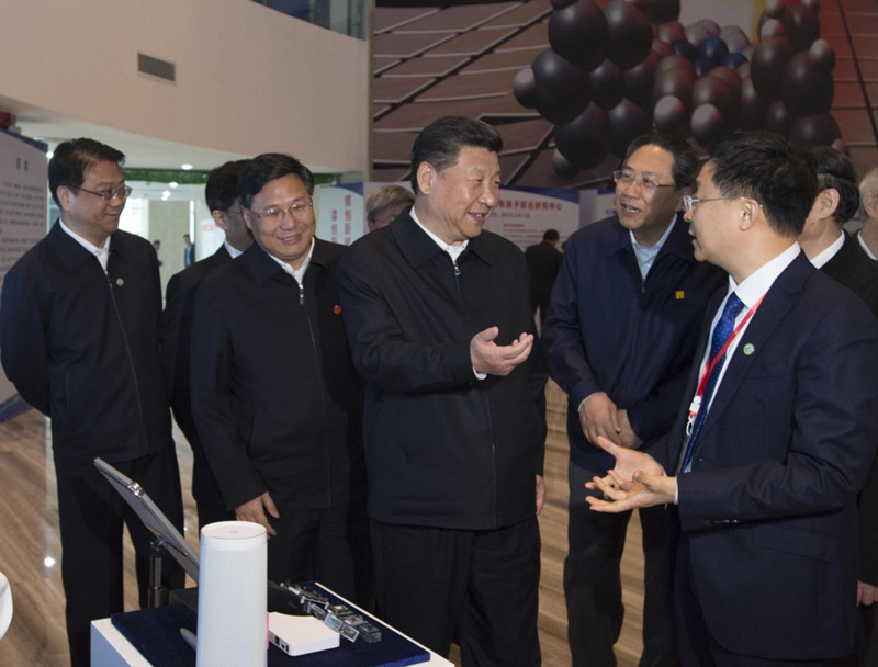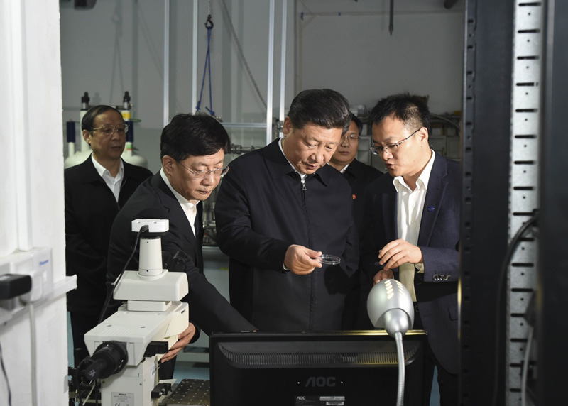 这是4月26日上午,习近平在中国科技大学先进技术研究院观看高新技术企业科技成果展示。新华社记者李学仁摄