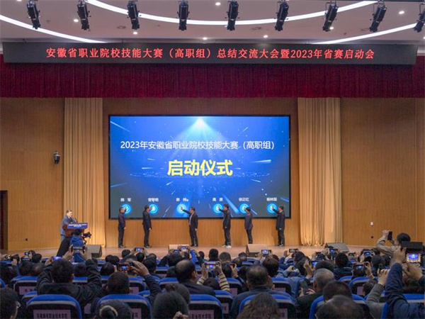 大会现场,各位领导共同按下按钮,标志着“2023年安徽省职业院校技能大赛(高职组)”正式启动。